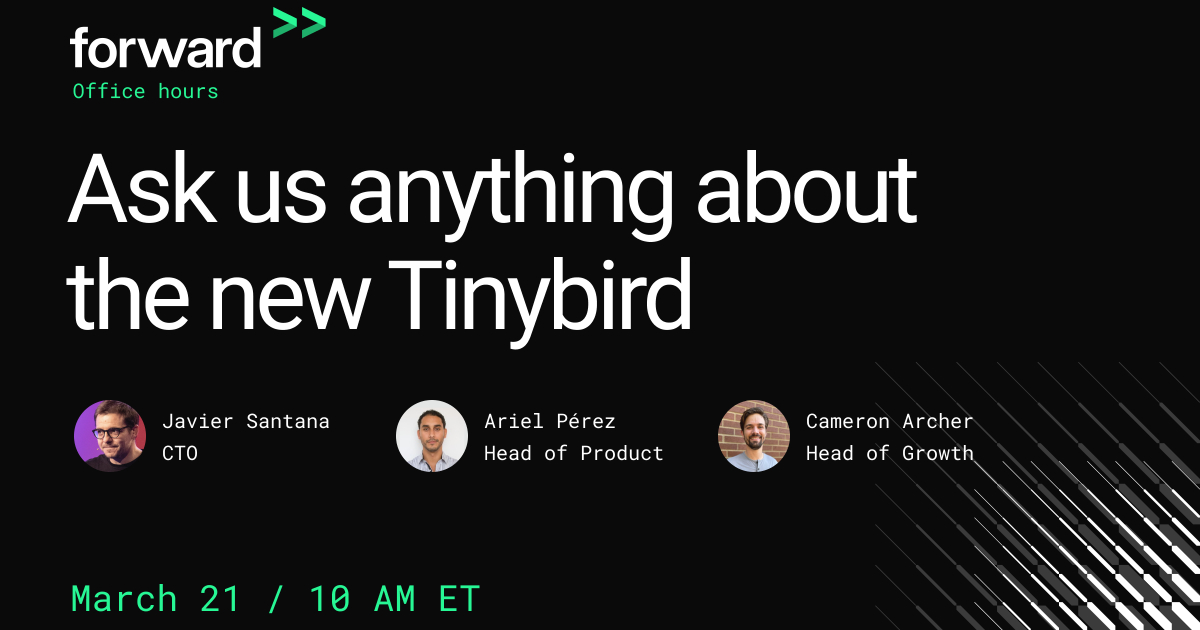 Tinybird Forward is the new UX that makes shipping software with big data requirements faster and more intuitive than ever. Join our office hours to ask us anything about Tinybird Forward.